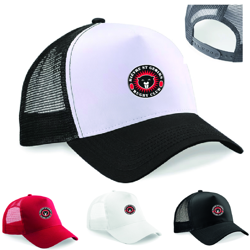 Avec écusson brodé – Panneau frontal et visière 100% coton. Panneaux arrière en maille filet 100% polyester. 5 panneaux. Visière préformée. Ajustable par languette de réglage rétro Snapback.